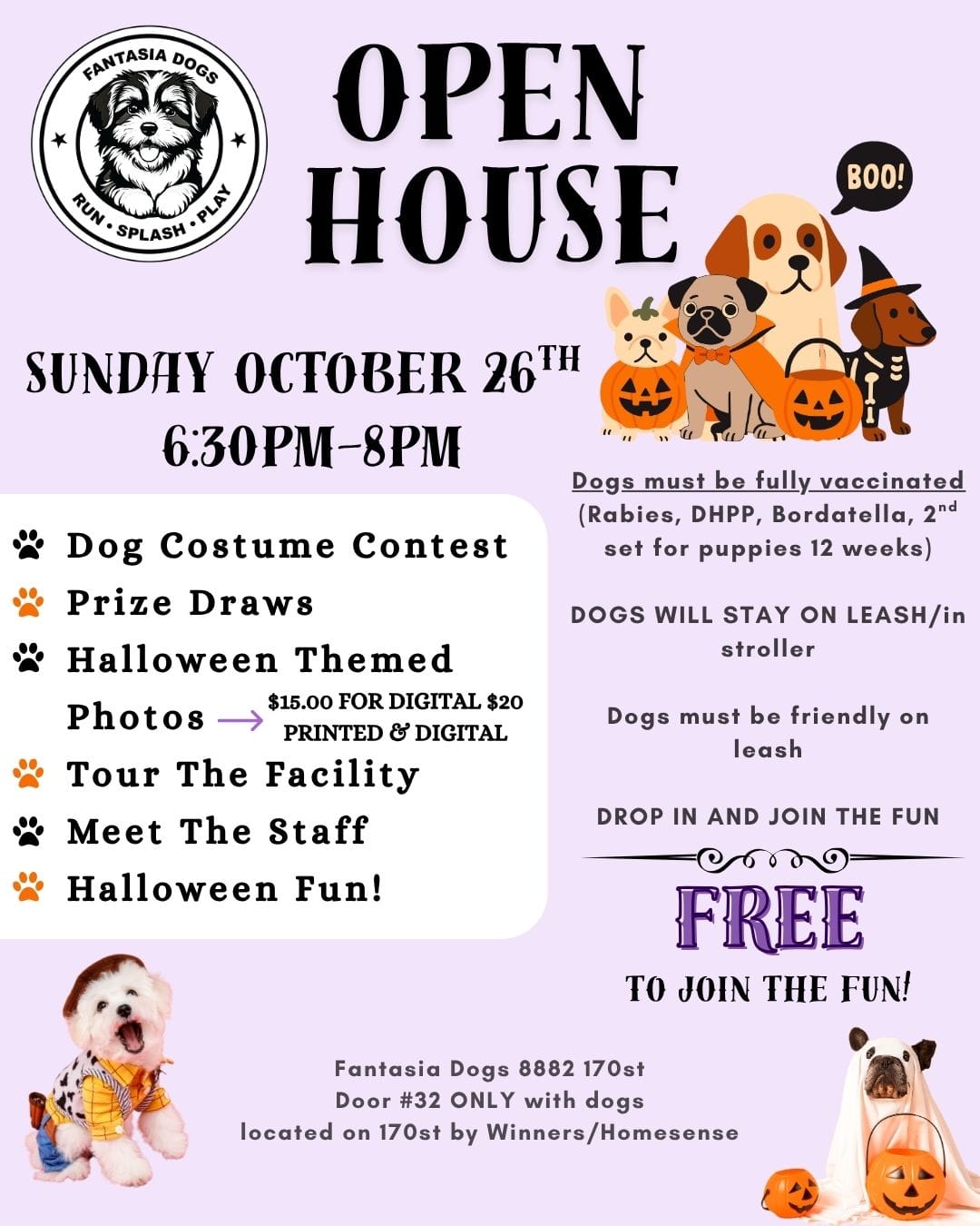 Dog costume contest, Prize draws, Halloween themed photos, and more!!